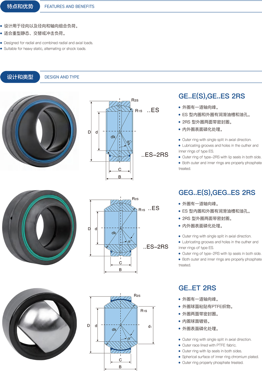 径向球面滑动轴承能够承受径向以及径向和轴向组合负载以及不对中。这种特定设计包括钢对钢滑动接触面组合。由于滑动表面为球面形,亦可在一定角度范围内作倾斜运动(即调心运动),在支承轴与轴壳孔不同心度较大时,仍能正常工作。轴承需要维护,可通过内外圈中的润滑孔和环形槽补充润滑。