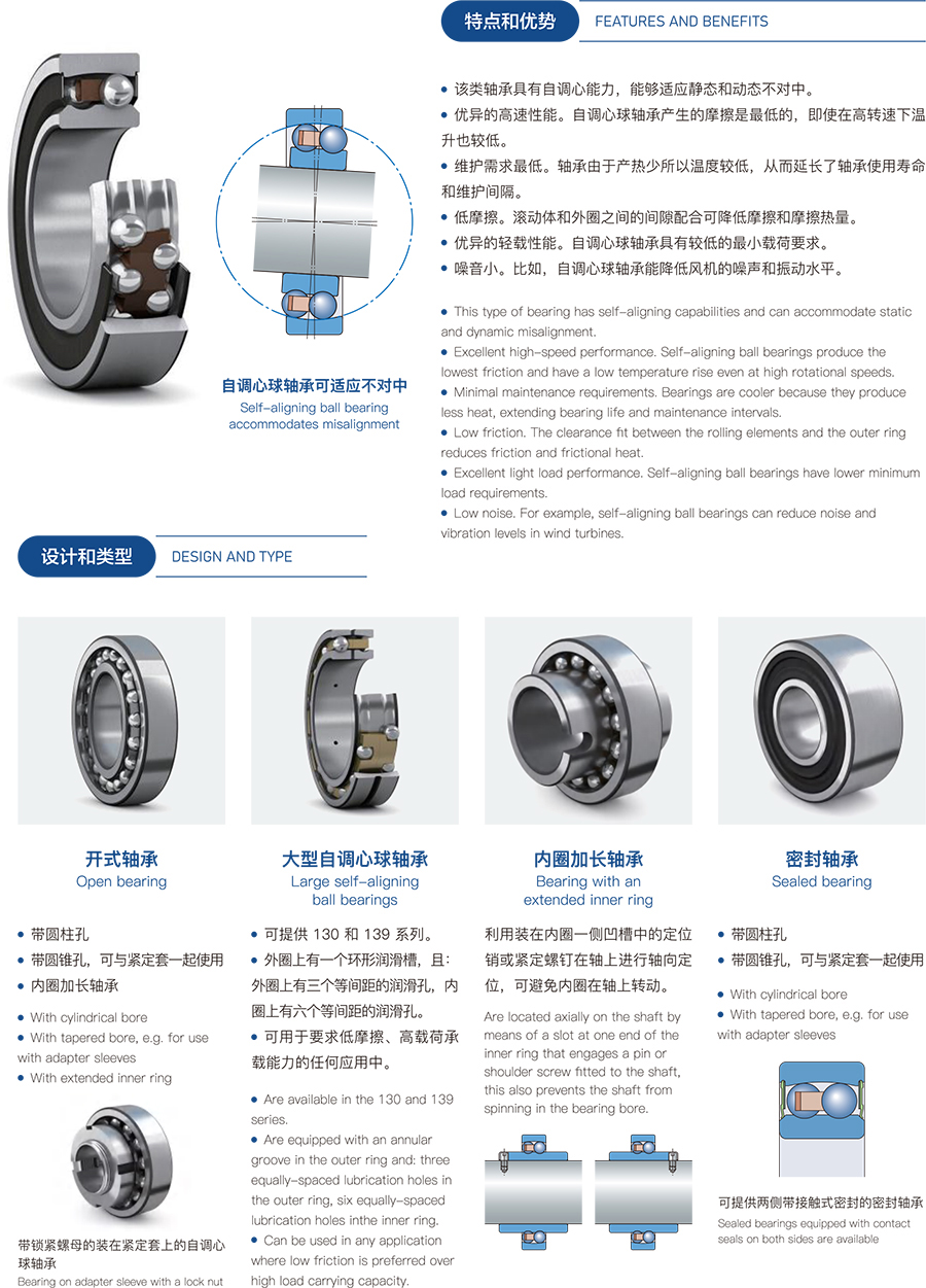 自调心球轴承有两列球形滚动体,同时外圈带有一条共用的球面滚道,内圈带有两条深沟型连续无间断滚道。它们可以是开口或密封的。该类轴承允许轴相较于轴承座出现较大的偏心,例如由轴挠曲引起的偏心。