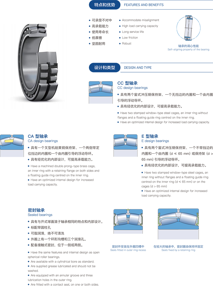 调心滚子轴承特别适用于具有重轴向载荷且难以对准轴承座的重型机概应用。这些轴承适用于涉及冲击或振动的恶劣工作条件的应用(重型机械、振动筛、破碎机等)。带有锥孔的型号允许使用紧定套进行安装。