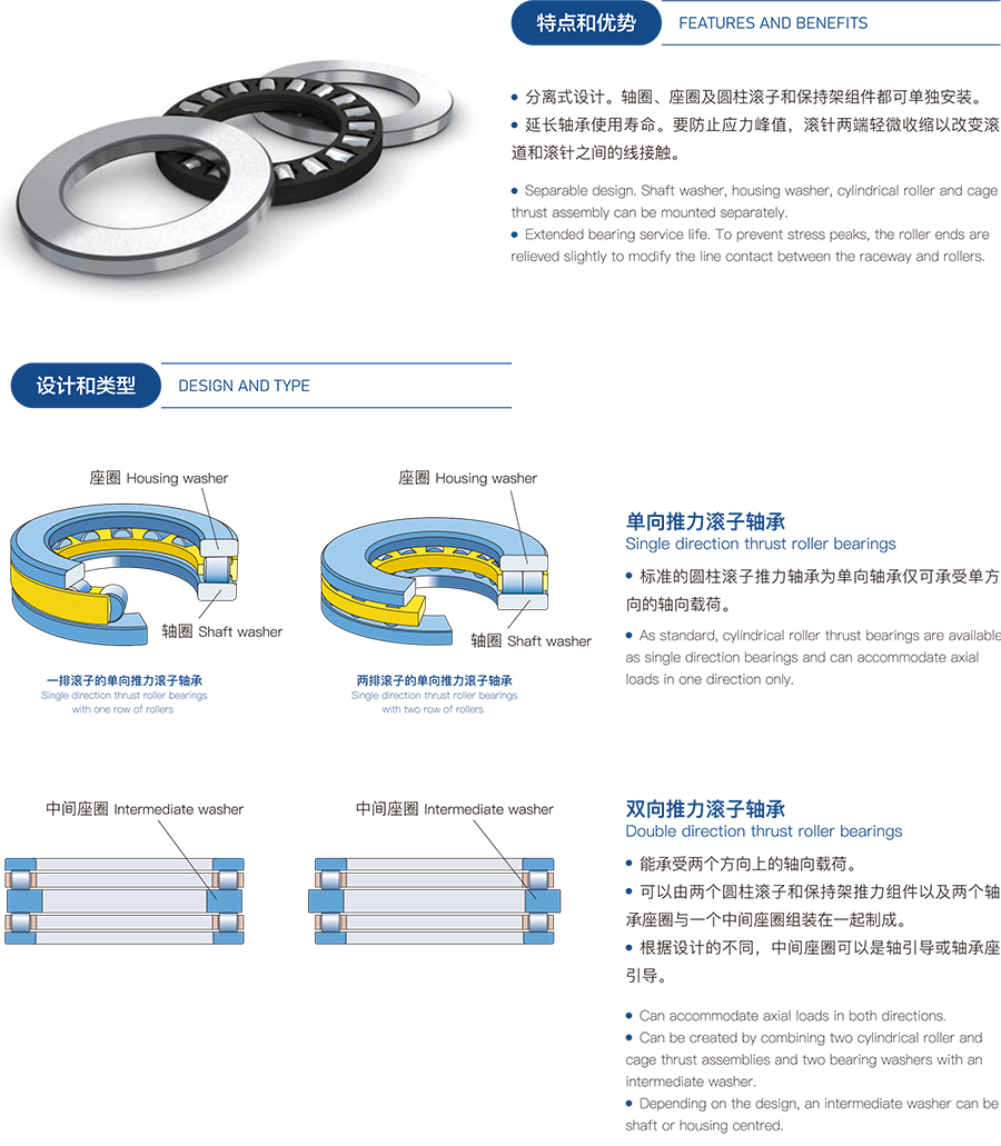 RVER圆柱滚子推力轴承可以承受较重轴向载荷和冲击载荷。这类轴承绝不能承受任何径向载荷,轴承刚度高且只需很小的轴向空间。